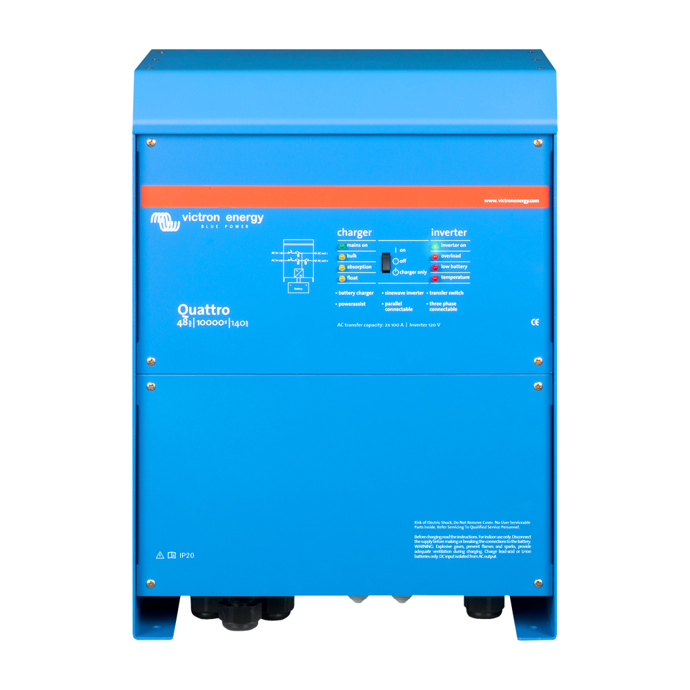 El Quattro es un aparato compuesto de un inversor y un cargador. Además, admite dos entradas CA y se conecta automáticamente a la entrada activa. Sus muchas características incluyen un inversor de onda sinusoidal pura, carga variable, tecnología PowerAssist híbrida, además de múltiples características para su integración en distintos sistemas, como sistemas trifásicos o de fase dividida.
